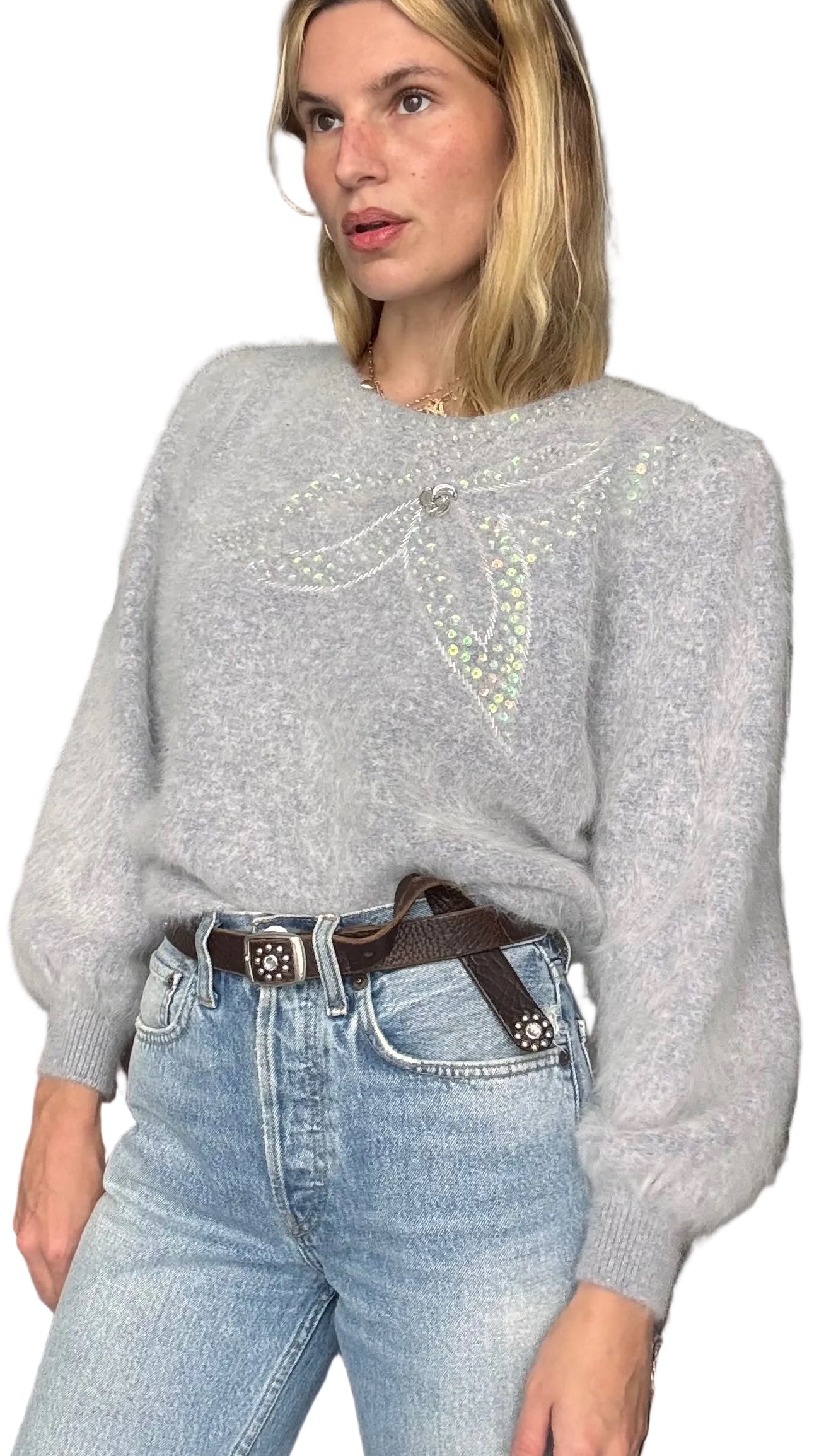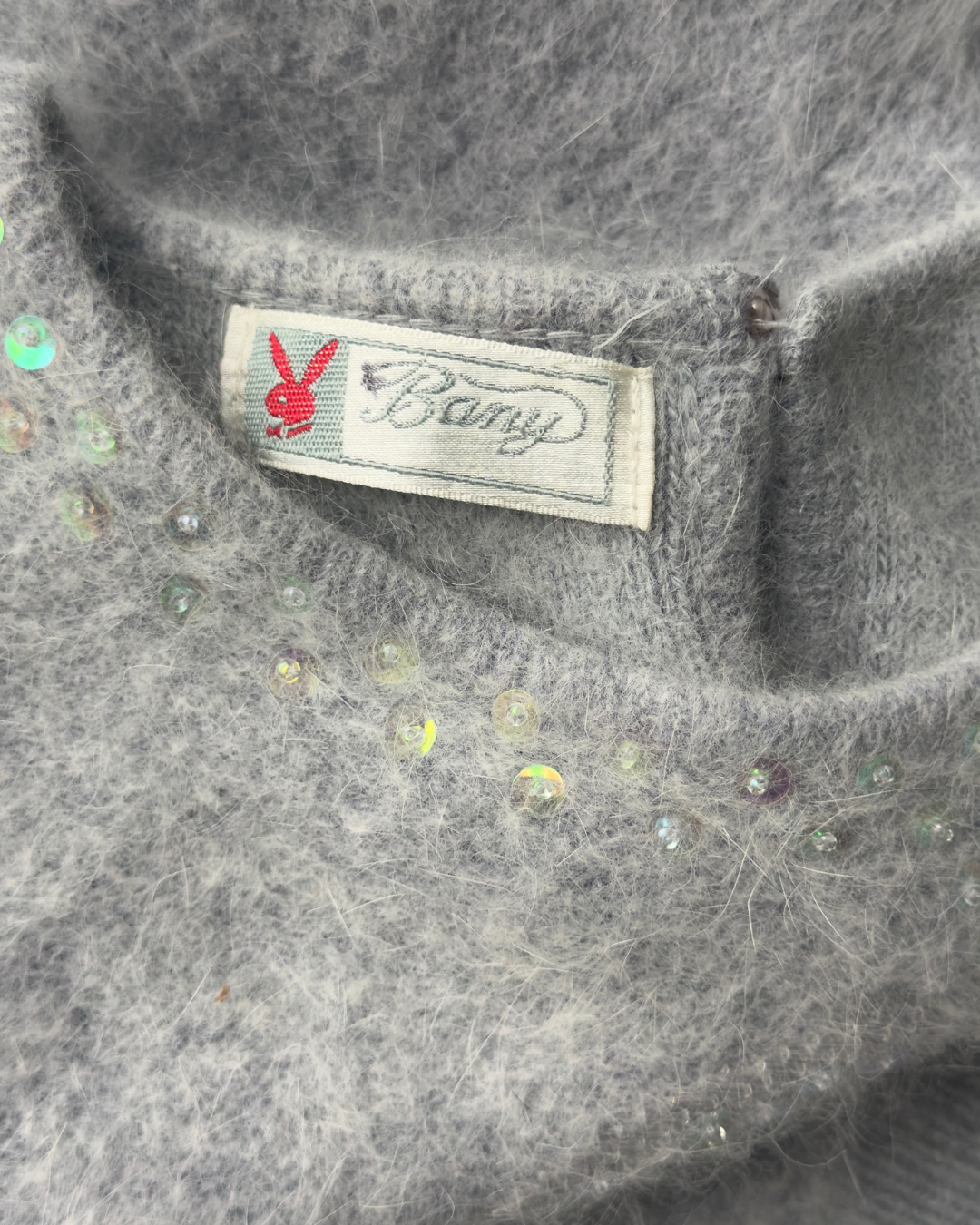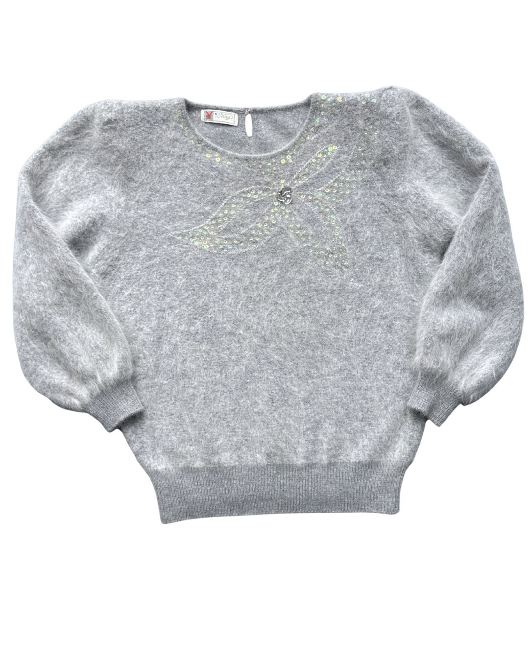 The bunny aka “bany” angora sweater, sequin, bead and gem embellishments , soft & warm , light grey