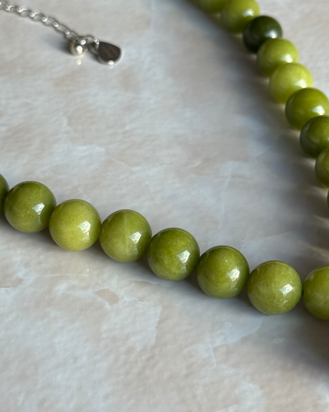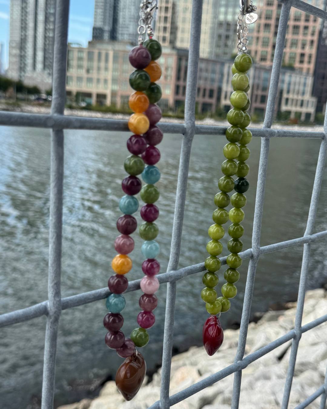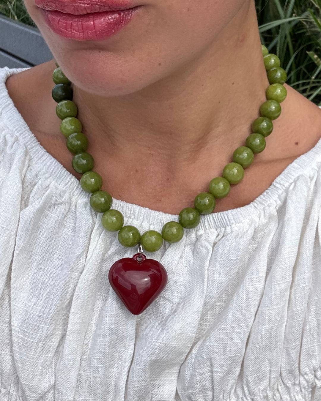 Hand crafted in New York, our ‘GOING GREEN’ necklace boasts stunning olive jade beads and a lightweight, acrylic pendant heart.